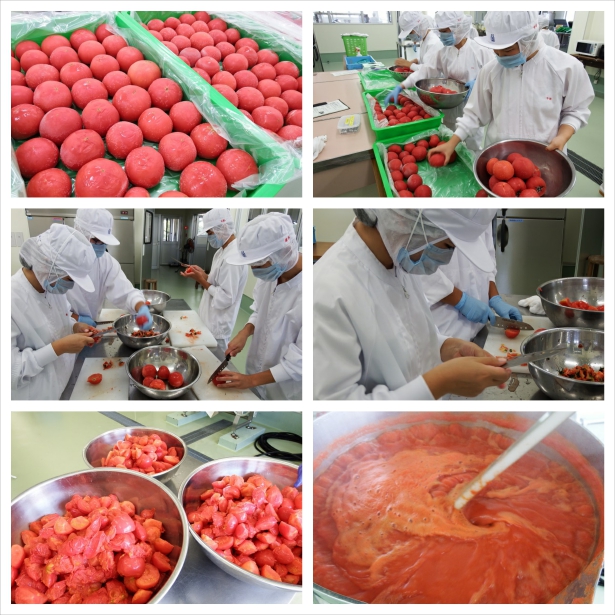 昨年度より改良を加えて、レベルアップした『イチゴジャム』を2年生で製造しました。品種は「紅ほっぺ」「かおり野」「さがほのか」の3種をブレンド。また、4月には『マーマレード』の製造も行いました。今年度は「有機JAS認定の甘夏(不知火産)」を使用しております。両商品とも販売まで、もうしばらくお待ちください。「どうぞ、おたのしみに~」