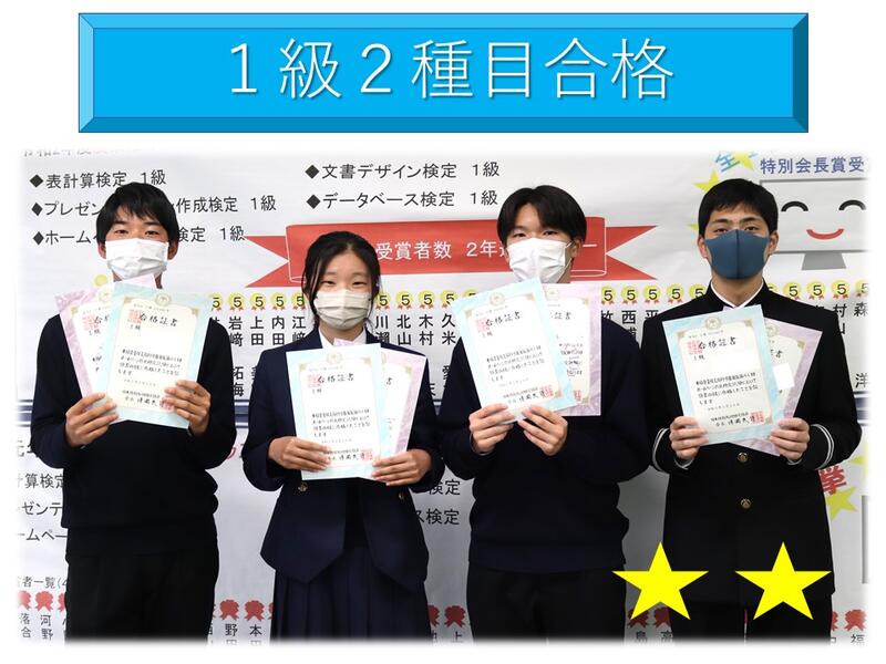 12月の日本情報処理検定で2年生2名が、早々と農業経済科の目標である1級5種目合格を達成しました合格キラキラ先輩に負けずと、1年生も頑張り1級を3名が合格しました期待・ワクワク