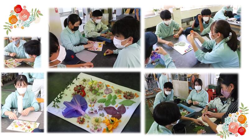 先日準備した押し花を使って、押し花絵体験を講師の方をお迎えして教えて頂きました。講師の先生方に優しく教えて頂き、花の形をそのまま活かしたデザインや花を組み合わせて何かをデザインした作品など個性豊かな作品ができました。文化祭では作品に込めた思いを川柳にして作品に沿えて展示しました。2年生の展示の部で「最優秀賞」を取ることができました