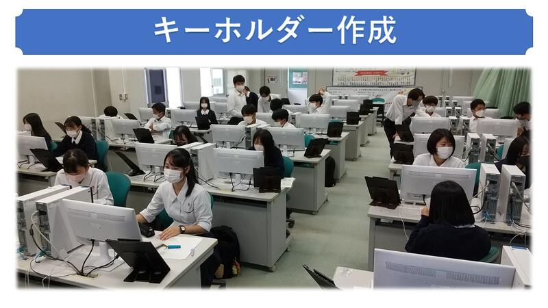 みんな、今まで学んできたパソコン技術を使って自分たちの好きなデザインのキーホルダーを作り、楽しくなった人は2,3個作っていました