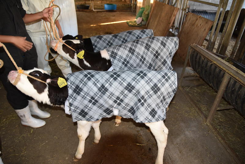 急に寒くなってきたこの頃、子牛たちも吹きさらしの牛舎で震えていました。そこで、生活科の先生のご協力で手作りのカーフジャケットを作ることになりました。まずは、試作をということで牛舎まで来ていただきサイズ合わせをしたりしながら作っていただいた作品がこのとおりです。とても素敵なかわいいジャケットができました。これから生まれてくる牛たちの分をみんなで作っていこうと思います。かわいい子牛たちのために。