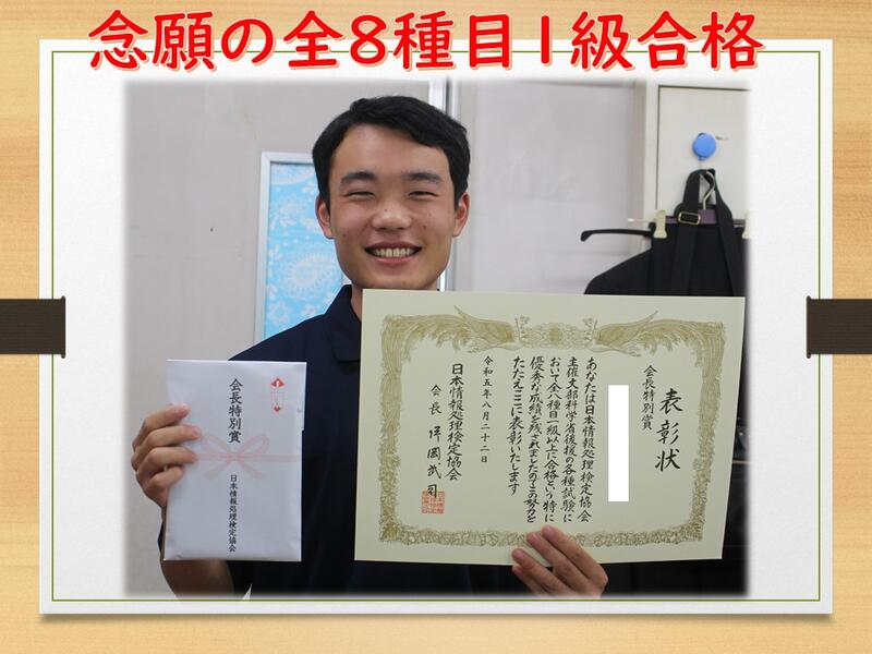 去年卒業した生徒が、在籍中に後1種目足りず達成できなかった全種目1級合格(日本情報処理検定)を卒業後も頑張り成し遂げましたおめでとう