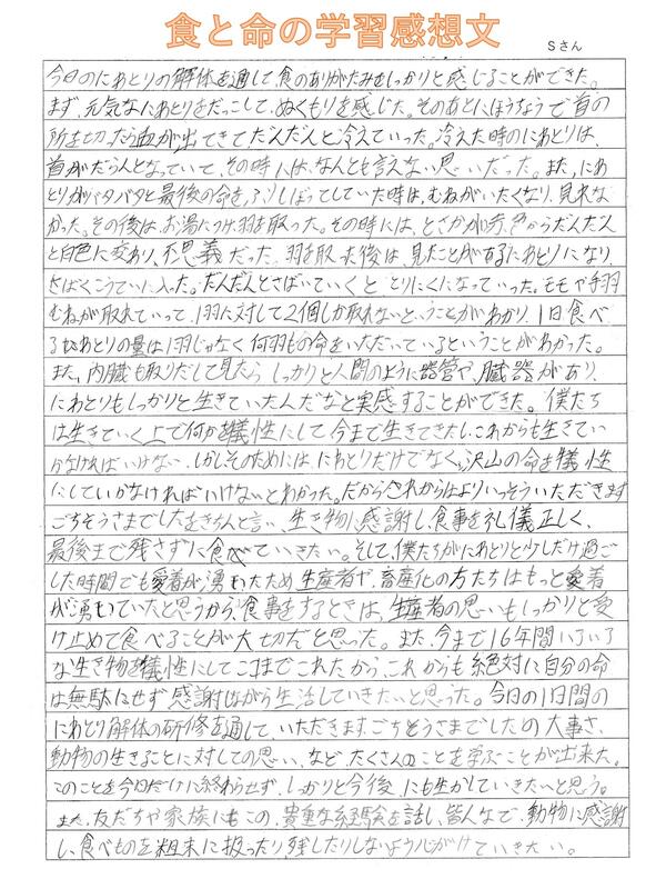 農業経済科では1年生で、食と命の学習として、ニワトリのと殺して解体、そして食べるという実習を行います。