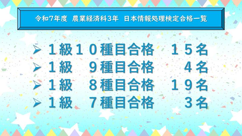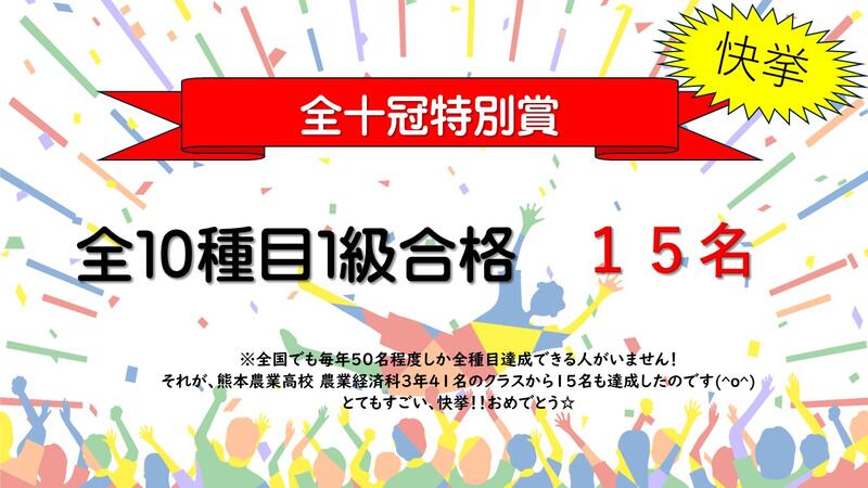 なんと、なんと、なんと全10種目1級合格が15名全国でも毎年合計50人ぐらいしか達成できない、とても難関レベルを農業経済科3年から15名も達成するのは快挙中の快挙