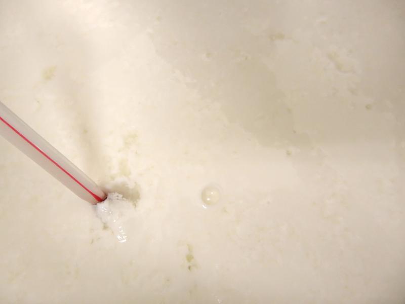 水に溶かした凝乳酵素を加えます。この酵素はチーズの製造に不可欠で、1gで30~50Lの牛乳を凝固させる力があります。