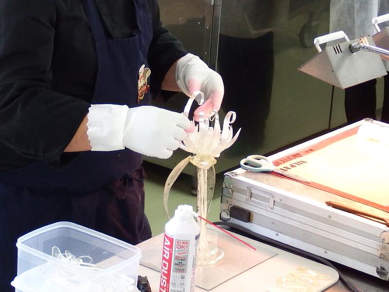 今回の講習会では、調製した飴が個々のパーツになり、1つの作品が作り出される過程を、清田様に実演していただきました