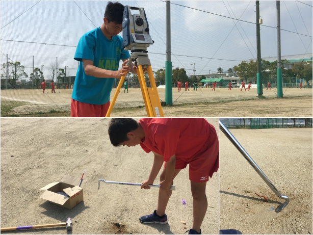 陸上競技場の300mトラックのポイント打設を行っていたところ、合宿中だったサッカー部(農業土木科)の生徒たちが手伝ってくれました。測量機器で距離と角度を計測してくれ、頼もしい限りです。