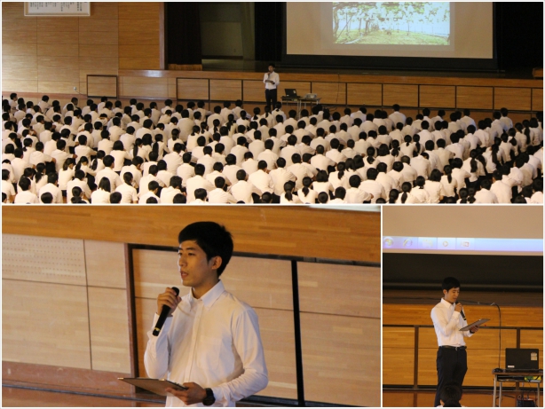 本校では一斉HR(全校集会)を毎月実施しており、本校職員が講師となって講話を行います。今月は食品工業科の川上先生(本校OB)でした。高校時代は園芸・果樹科で学ばれていました。自身の高校時代をビデオや写真で振り返り、「挨拶力」というキーワードを熊農生に伝えて頂きました。