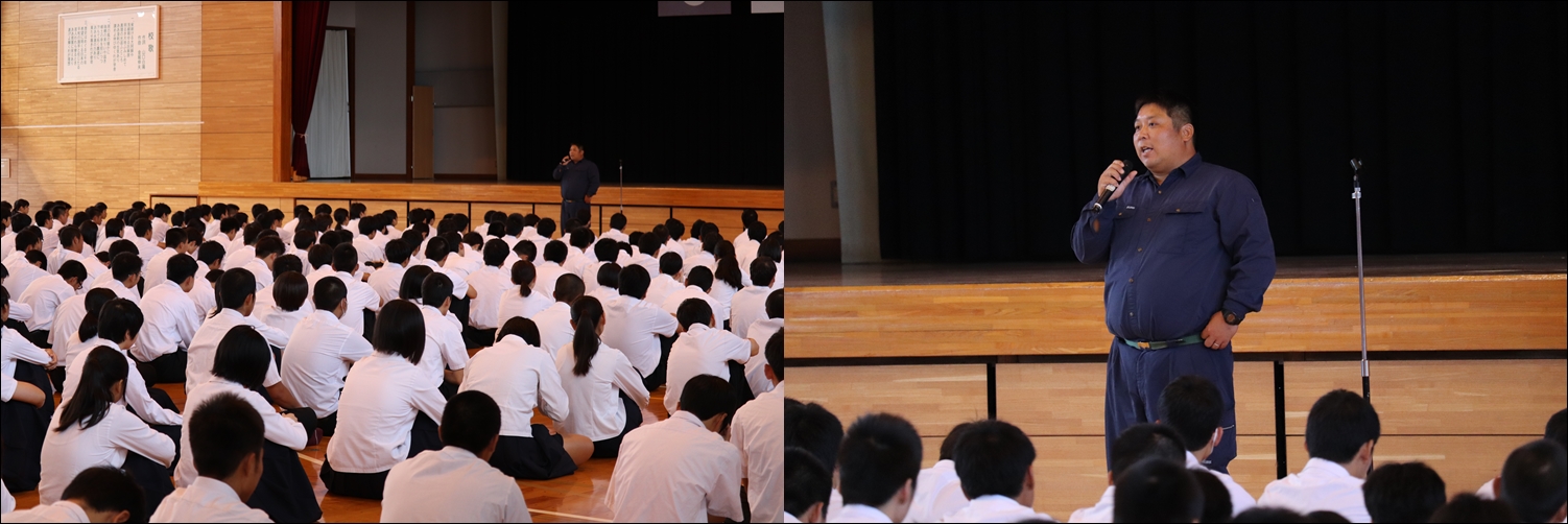 自らの生い立ち、経験から進路選択をしたこと。様々な職種を経験するなかで「人の役に立たない仕事はない」ということに気付いたということを生徒に熱く語ってくれました。