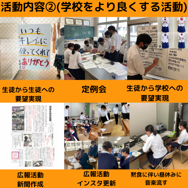 さらに、SNSを通じた生徒会活動の情報発信、校則の見直し、感染予防対策活動、平成6年から一部改定のみにとどまっていた生徒会会則を生徒会憲章へと大幅に改正しました。