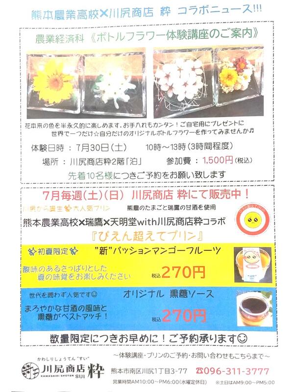 農業経済科の生徒がボトルフラワー体験講座を川尻商店『粋』で開催します。