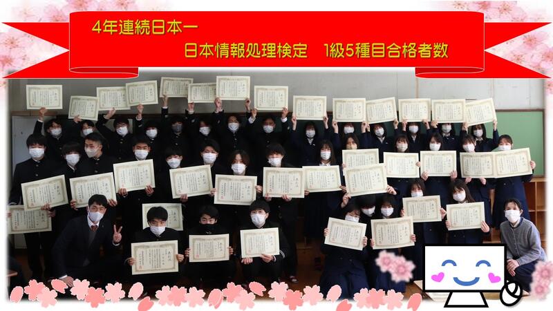 3年間、パソコンの練習をコツコツ頑張って、日本情報処理検定1級5種目以上(日本情報処理会長賞)を34名が達成することができました。目標に向かって一生懸命努力する姿はとてもかっこよかったです先輩の姿を見て、後輩たちも頑張っていますよ