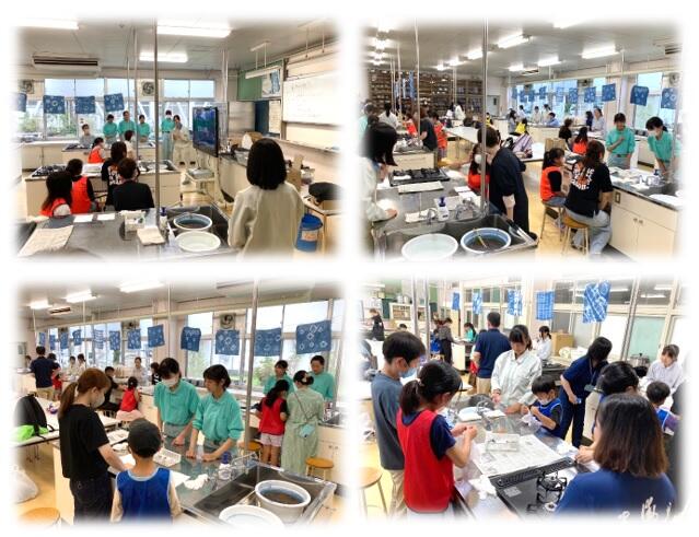 7月14日にJAくまもと主催のあぐりキッズスクールが熊本農業高等学校で開催されました。約80名の子ども達とその保護者の方達にハンカチの藍染めを体験してもらいました。