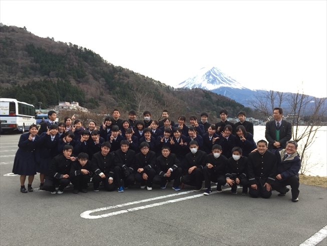 宿泊は河口湖のほとりにあるホテルです。雪化粧をした富士山をバックに各クラス記念撮影をしました。間近で見る大迫力の富士山に生徒たちは圧倒されていました。