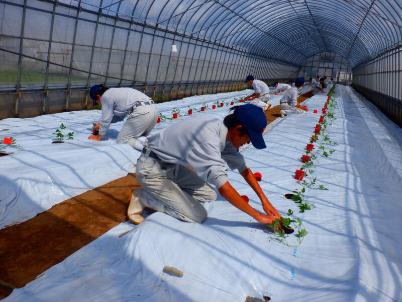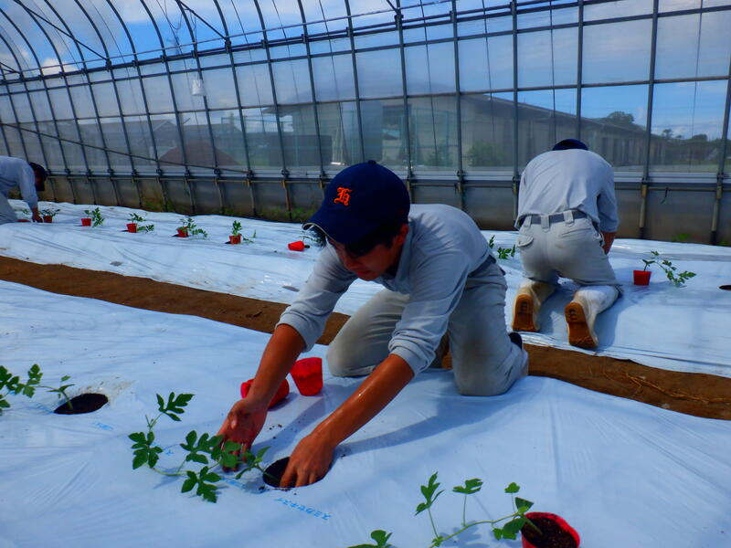 園芸・果樹科の野菜専攻生が小玉スイカ(「ピノガール」「ひとりじめ」)の定植を行いました。