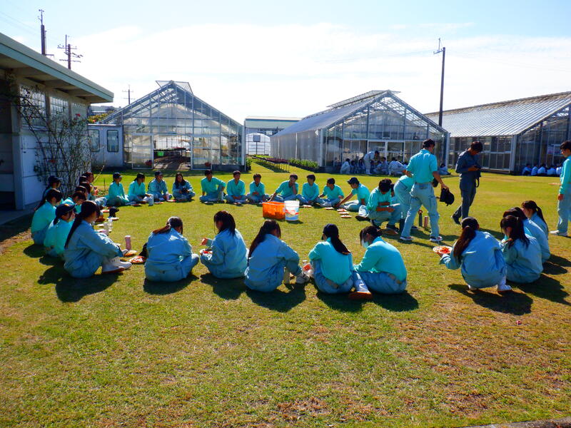 では、野菜(スイカ、メロン、ミニトマト、キュウリ、ひご野菜など)、草花(シクラメン、ベゴニア、バラ、花苗など)、果樹(デコポン、ブドウ、モモ、温州ミカン、太秋柿など)の栽培を中心に学ぶ学科です。これらの教材を活かしたプロジェクト活動をはじめ、農業クラブ活動である、フラワーアレンジ大会や鑑定競技等の各種大会に参加し、活躍しています。