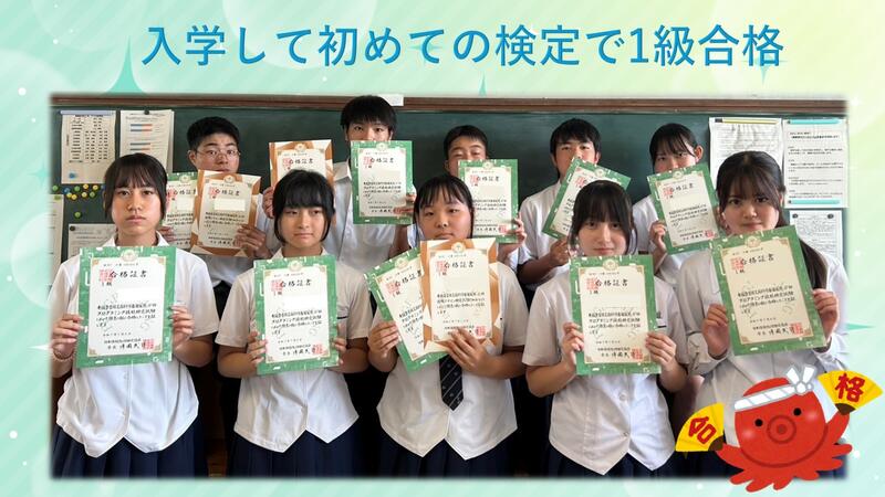 1年生は入学して約3ヶ月半、パソコンの練習を行い、7月の初めての検定でプログラミング1級、情報デザイン検定1級に合格しました花丸初めての検定で緊張していましたが、試験が始まると集中して頑張っていました期待・ワクワク合格おめでとうキラキラ