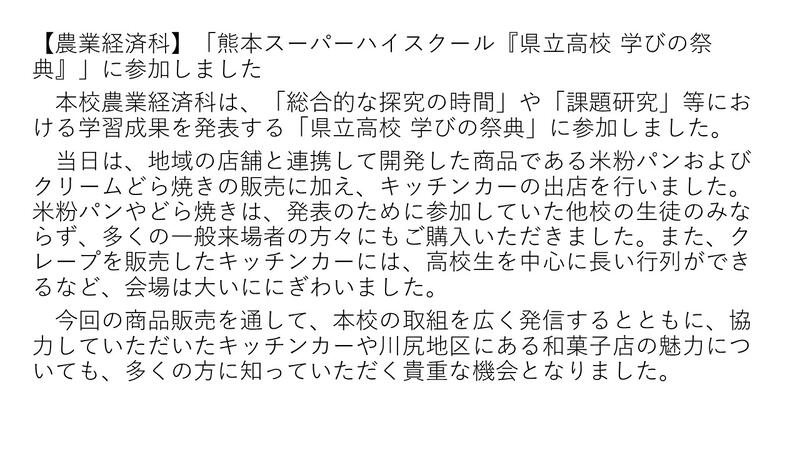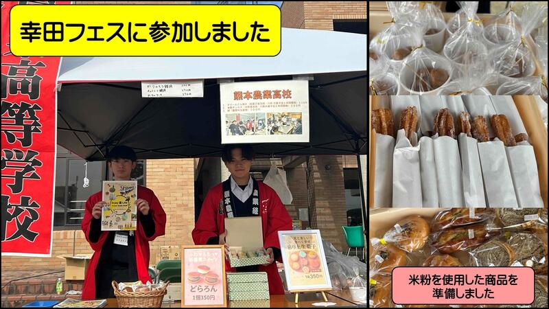 熊本市南区が主催する「幸田フェス ~防災・エコ・ふれあいでつくる地域の未来~」に課題研究(米粉普及活動)で開発した商品を出店しました。このイベントに初めて参加したので、どのぐらいのお客さんが来場するか不安でしたが、序盤は地域の小中学生や小さいお子さん連れの親子がたくさん来てくれました。特に「米粉チュロス」が人気で、開始1時間ほどで完売してしまうほどの大好評でした。また米粉入りのパンやかりんとう饅頭なども完売しました。