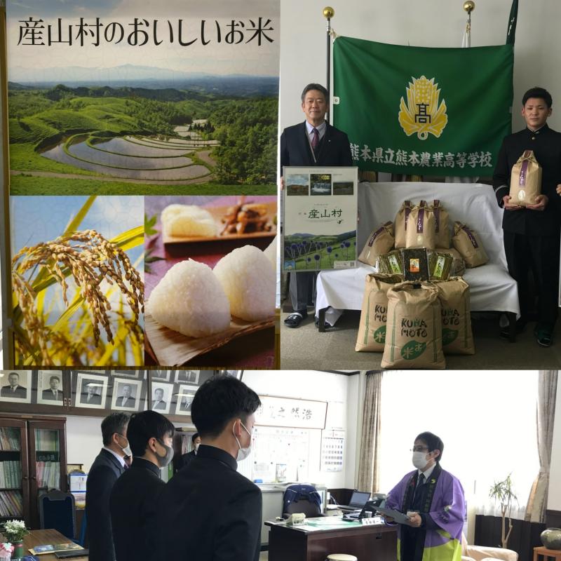 先日、産山村役場の総務課より 荻 様が来校され、産山村で生産された農産物の贈呈式がありました。「コロナ禍においても美味しいものをいっぱい食べて体力の増進、健康維持に努めてほしい」というメッセージを添えて、産山村の美味しいお米150kgと産山村の名産物を大量にご寄附いただきました。贈呈式では、産山学園(産山中学校)卒業生の井君が「このお米を食べて、故郷を思い出しながら頑張ります」とコメントし、会場は温かい雰囲気に包まれていました。今回ご寄附いただいた農産物は本校の南園寮の食事で提供さる予定です。産山村の皆様、本当にありがとうございました!