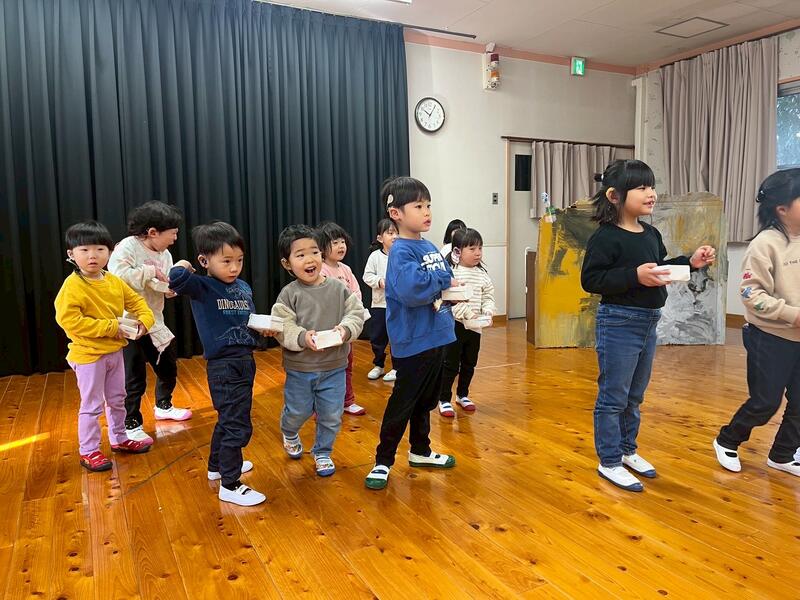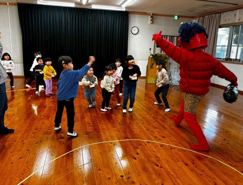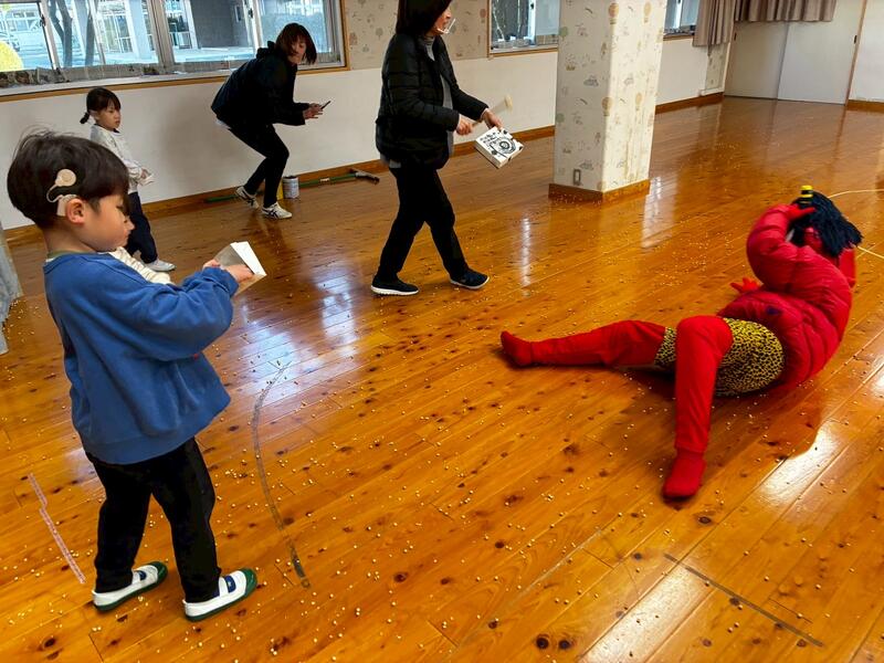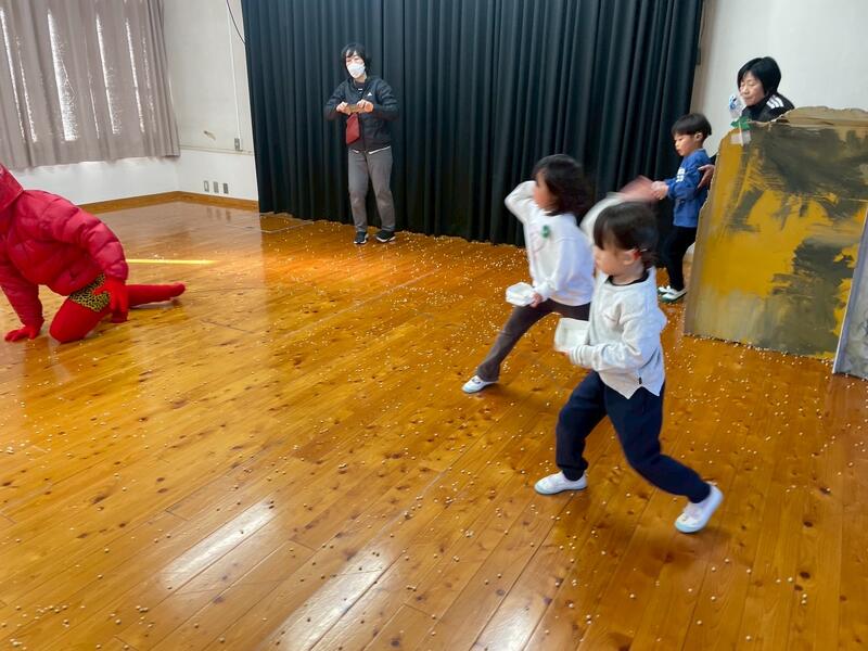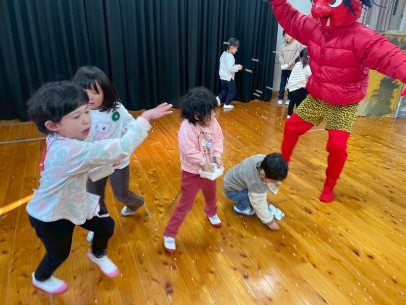 枡に豆を入れて、鬼の登場を真剣な表情で待っているところに、大きな赤鬼が登場しました。鬼に近づき一生懸命豆をまいた子供、鬼から距離を取り離れた所から豆をまいた子供、以前は「ママ、ママ」と泣いていたけれど、今年は泣かずに最後まで豆をまいた子供など頑張った姿を見ることができました。みんな頑張りました。