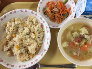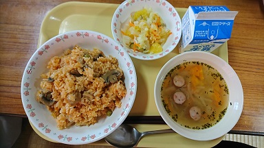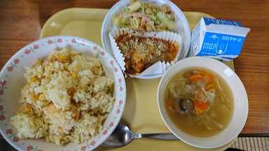 「エビピラフ、牛乳、彩り野菜スープ、豆腐グラタン、イタリアンサラダ」