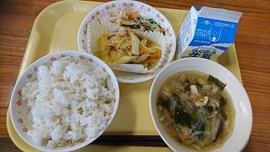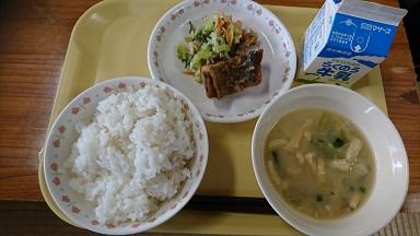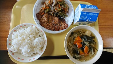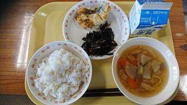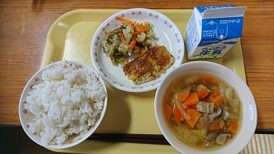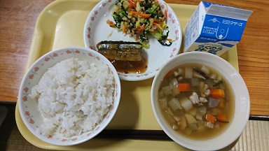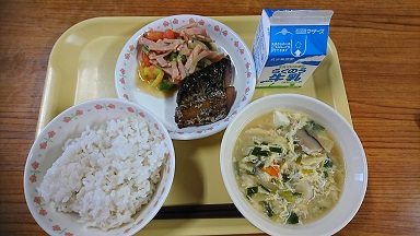「麦ごはん、牛乳、魚のちゃんちゃん焼き、五目あえ、乾物スープ」でした。