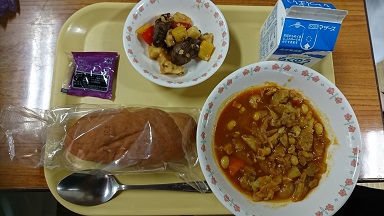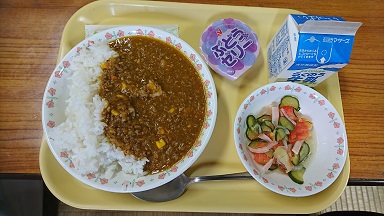 「ドライカレー、牛乳、トマトとハムのマリネ、ぶどうゼリー