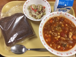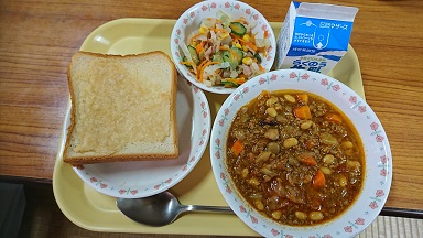 「ガーリックトースト、牛乳、チリコンカン、ブロッコリーのサラダ」でした。