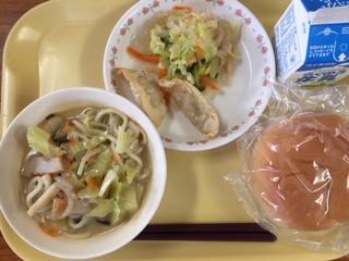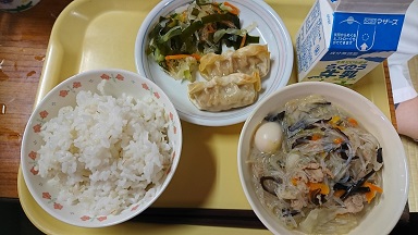 今日の給食は「丸パン、ちゃんぽん、餃子、中華サラダ」でした。