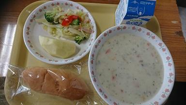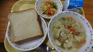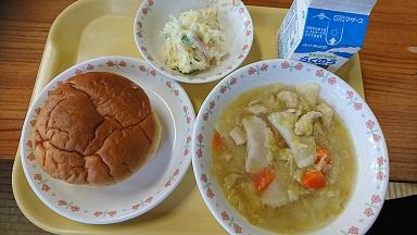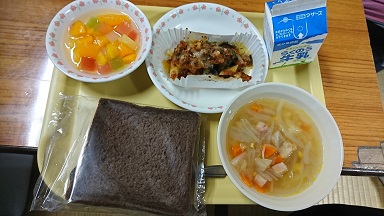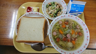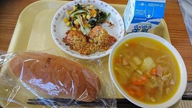「コッペパン、牛乳、鶏肉の香草焼き、わかめとコーンのサラダ、野菜スープ」でした。