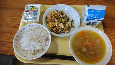 「麦ごはん、牛乳、白身魚の西京焼き、オクラのあえもの、にら入りかき玉汁」