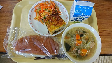 「ミルクパン、牛乳、コンソメスープ、オムレツ、人参サラダ」