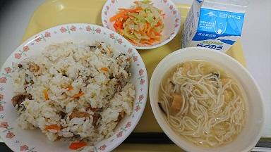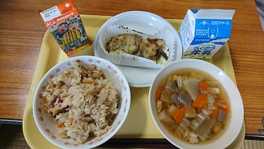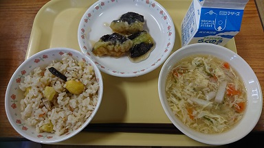 「秋の香ごはん、牛乳、かきたま汁、揚げだしなす」