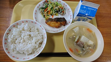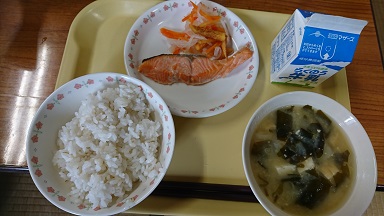 「麦ごはん、牛乳、鮭の塩焼き、柿なます、厚揚げのみそ汁」
