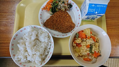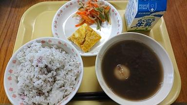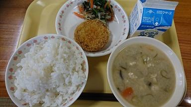 「麦ごはん、牛乳、枝豆と豆腐のミンチカツ、いそあえ、みそけんちん汁」でした。
