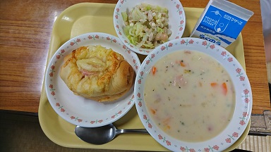 「コッペパン、牛乳、クラムチャウダー、フレンチサラダ、りんご」です。