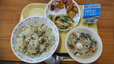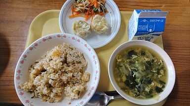 「高菜チャーハン、牛乳、タイピーエン、海藻サラダ、大学いも」でした。