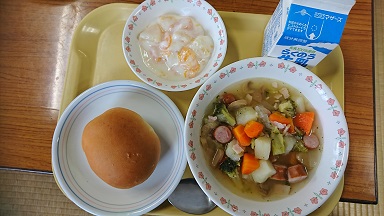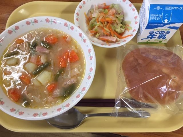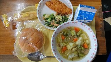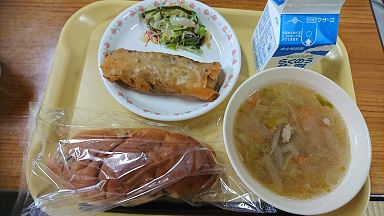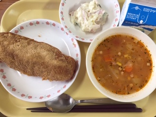 「コッペパン、牛乳、はちべえトマトスープ、魚のマヨマスタード焼き、みかん果汁」でした。