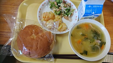 「丸パン、牛乳、エビマヨ、ビーンズサラダ、チンゲンサイスープ」