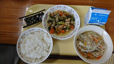 「麦ごはん、味つけのり、牛乳、鶏肉炒め、春雨汁」