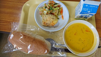 「コッペパン、牛乳、かぼちゃのポタージュ、ささみもチーズ焼き、ベーコンと野菜のソテー」