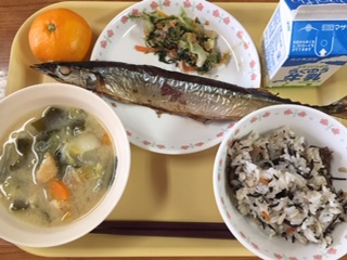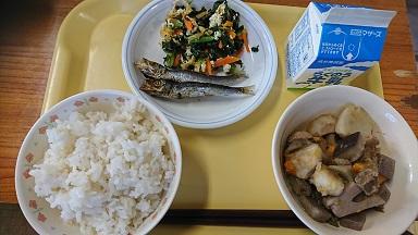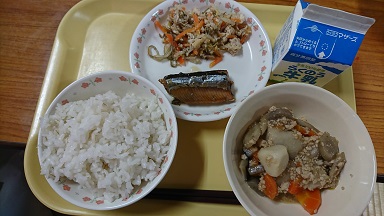 「麦ごはん、牛乳、さんまのレモンかぼす煮、五目あえ、里芋のそぼろ煮」