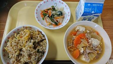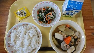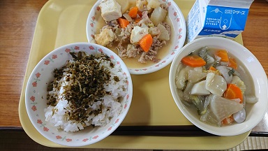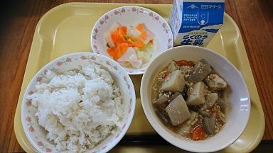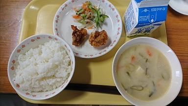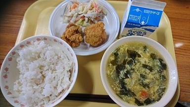 「ごはん、牛乳、からあげ、ごぼうのマヨネーズサラダ、かきたま汁」でした。