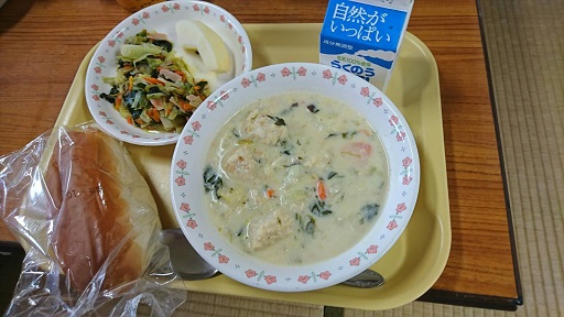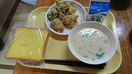 「チーズパン、牛乳、ポテトサラダ、ラビオリスープ」でした。
