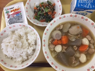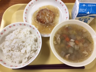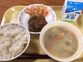 今日の給食は、「麦ごはん、のっぺい汁、きのこの和風ハンバーグ」でした。