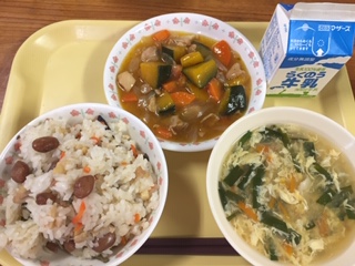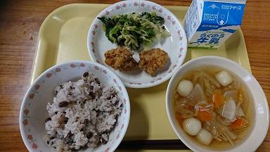 「赤飯、牛乳、からあげ、ほうれんそうのおひたし、はんぺん汁」でした。