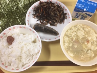 「麦ごはん、牛乳、めざし、菜焼き、筑前煮」でした。