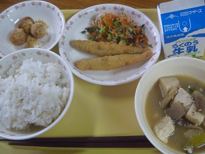 「麦ごはん、牛乳、かつおフライ、ごまあえ、親子煮」