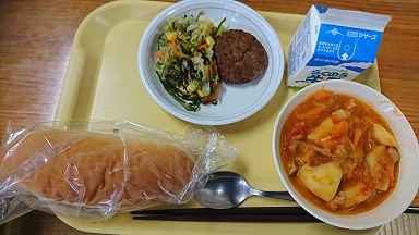 「コッペパン、牛乳、チーズインハンバーグ、わかめとコーンのサラダ、トマトスープ」