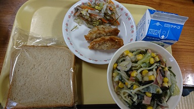 「黒糖パン、牛乳、ぎょうざ、甘酢あえ、コーンラーメン」